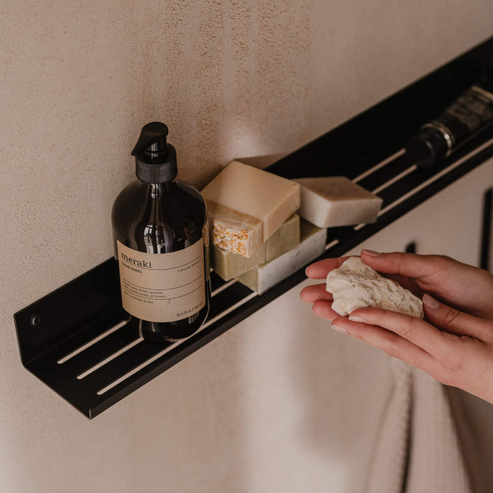 En sort brusehylde skaber kontrast og passer flot til mørke armaturer eller sorte brusesprosser. Giver et roligt, grafisk helhedsindtryk.