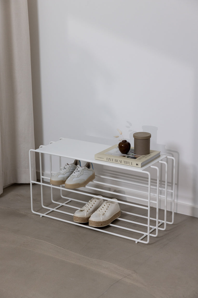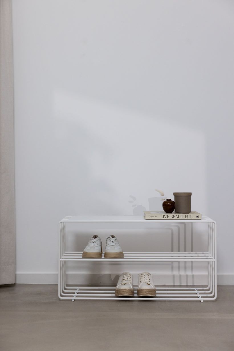 Saknar du något specifikt i din hall? Då kommer du definitivt att gilla skostället NEVA - en unik skobänk i metall med loftstil. Den integreras avslappnat som en verkligt unik del av heminredning i alla entréer. Den smala metallhyllan kan även användas som bänk i entrén. Med sin lättskötta yta är den inte bara tidlös, utan också hållbar. Detta unika skoställ finns i olika färger.