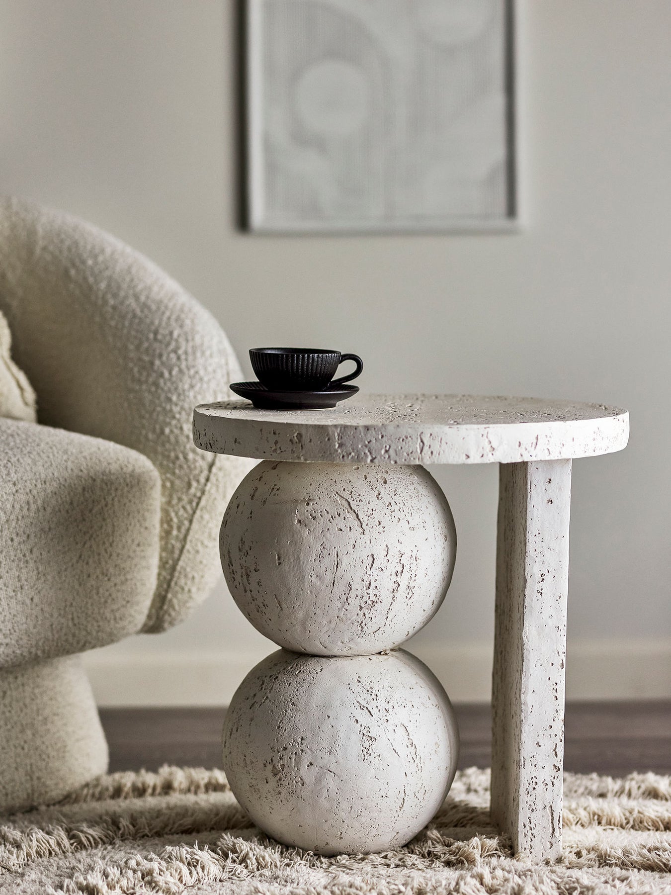 Tally Sidebordet fra Bloomingville er et skulpturelt sidebord i resin med en oliemalet overflade. Bordet er formet som to stablede kugler og har en blød, hvid tone med et travertin-look. Små variationer i mønster og farvestyrke kan forekomme, hvilket gør hvert bord unikt.