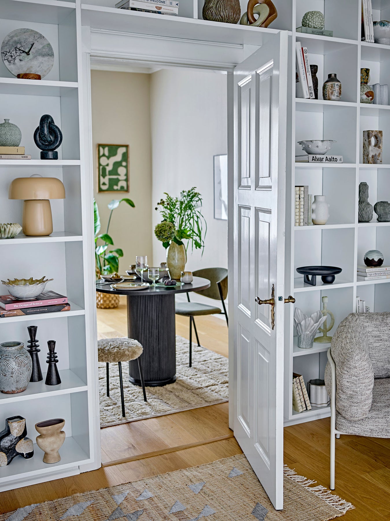 Porto spisebordet fra Bloomingville, fremstillet af FSC-certificeret mangotræ med sortbejdset finish, har en cylinderformet base og en rund bordplade med synlige træstrukturer. Et elegant og funktionelt design, perfekt til samvær med familie og venner.