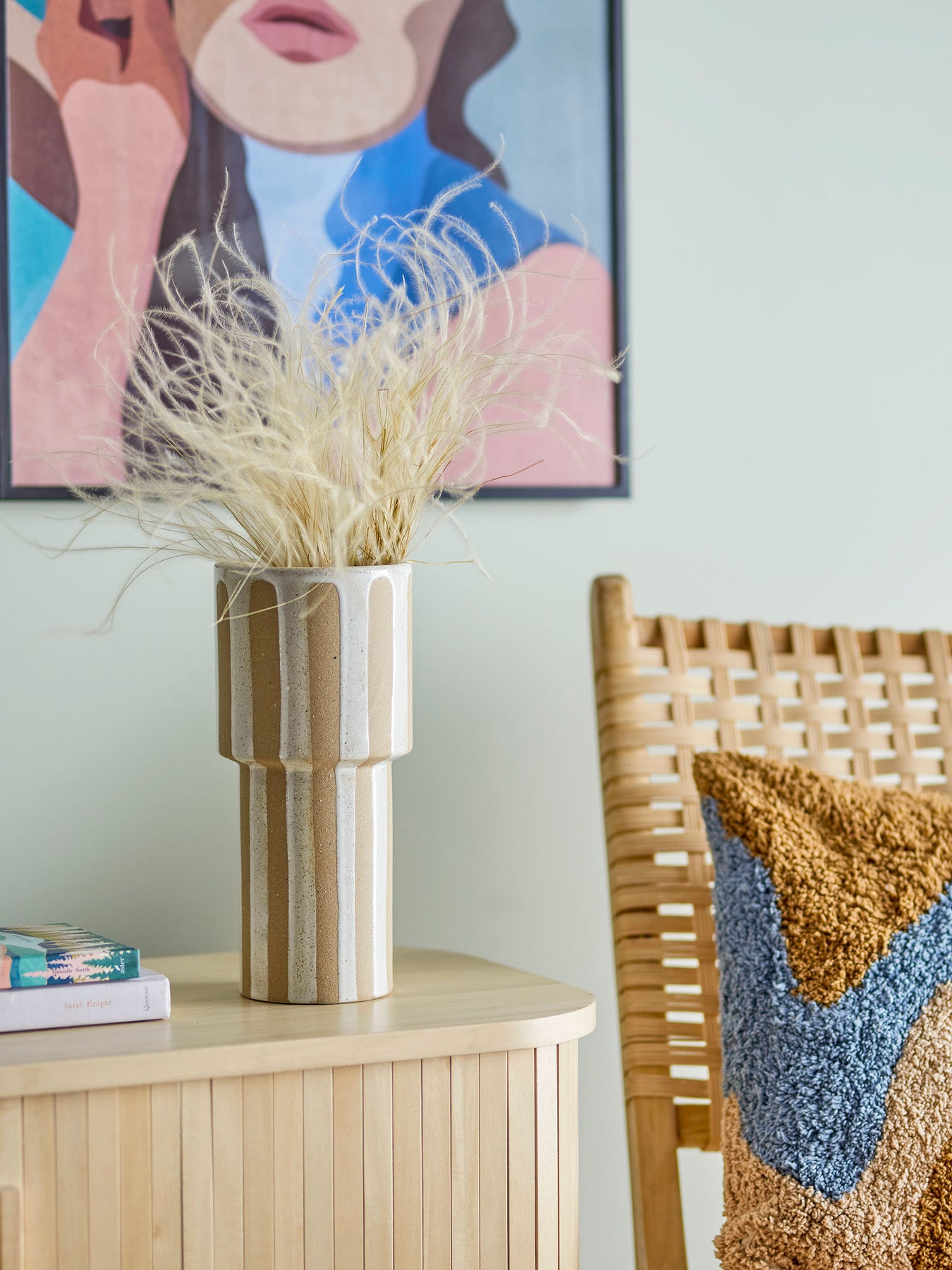 Awah Vasen fra Bloomingville er dekoreret med en smuk hvid glasur, hvilket giver den et rustikt og unikt udseende. Vasen er ideel til buketter, grene eller tørrede blomster - dens enkle og stilfulde design vil tilføje et strejf af nordisk stil til hjemmet.