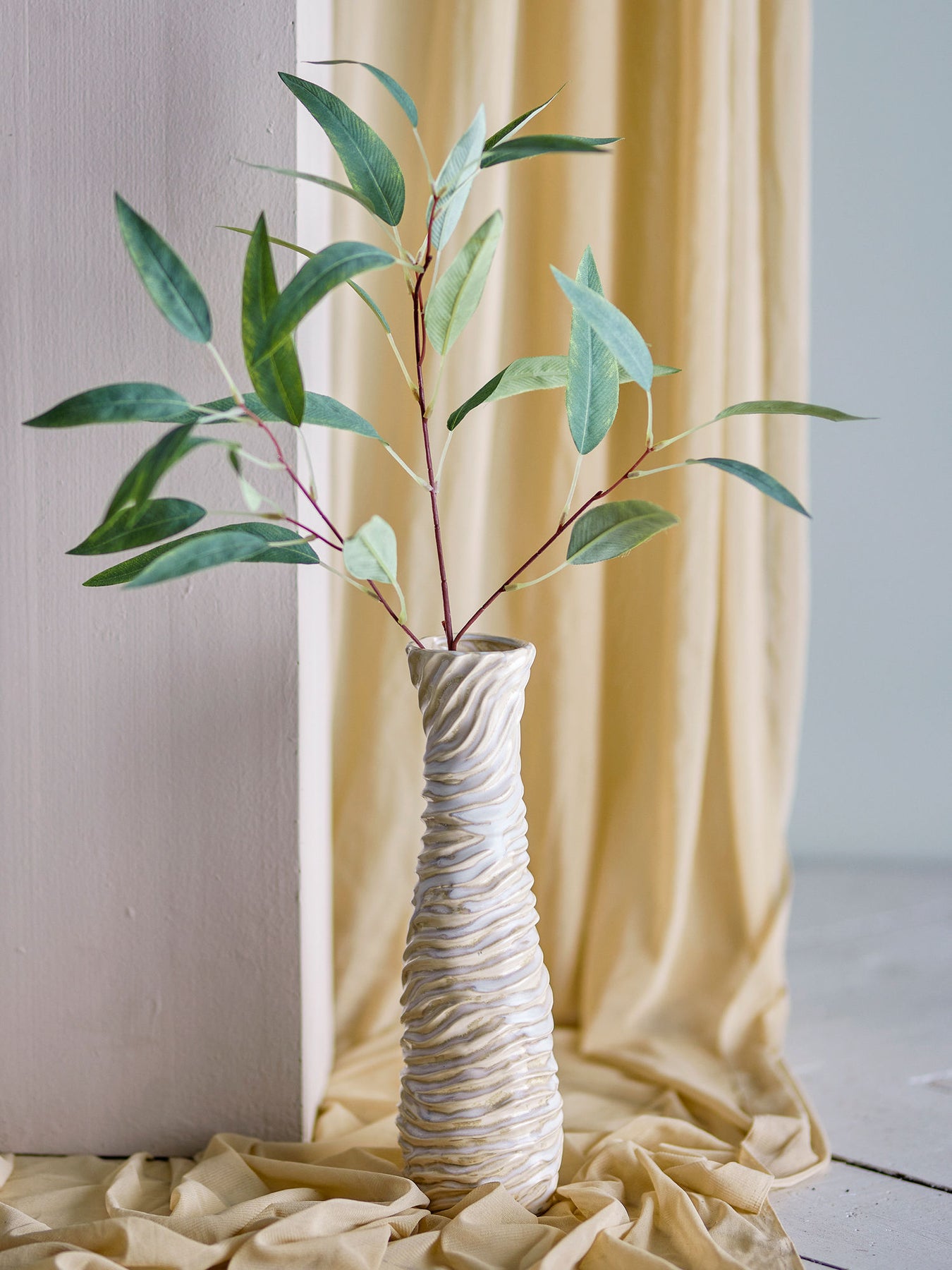 Damien Vasen fra Bloomingville bringer en fornemmelse af elegance til hjemmet. Med sin snoede form og lyse finish, står vasen stolt alene eller som en del af en dekorativ gruppe. Den er ideel til lange grene eller blomster, som tilføjer et naturligt og friskt pust til ethvert rum. Glasuren kan medføre variationer i farven.