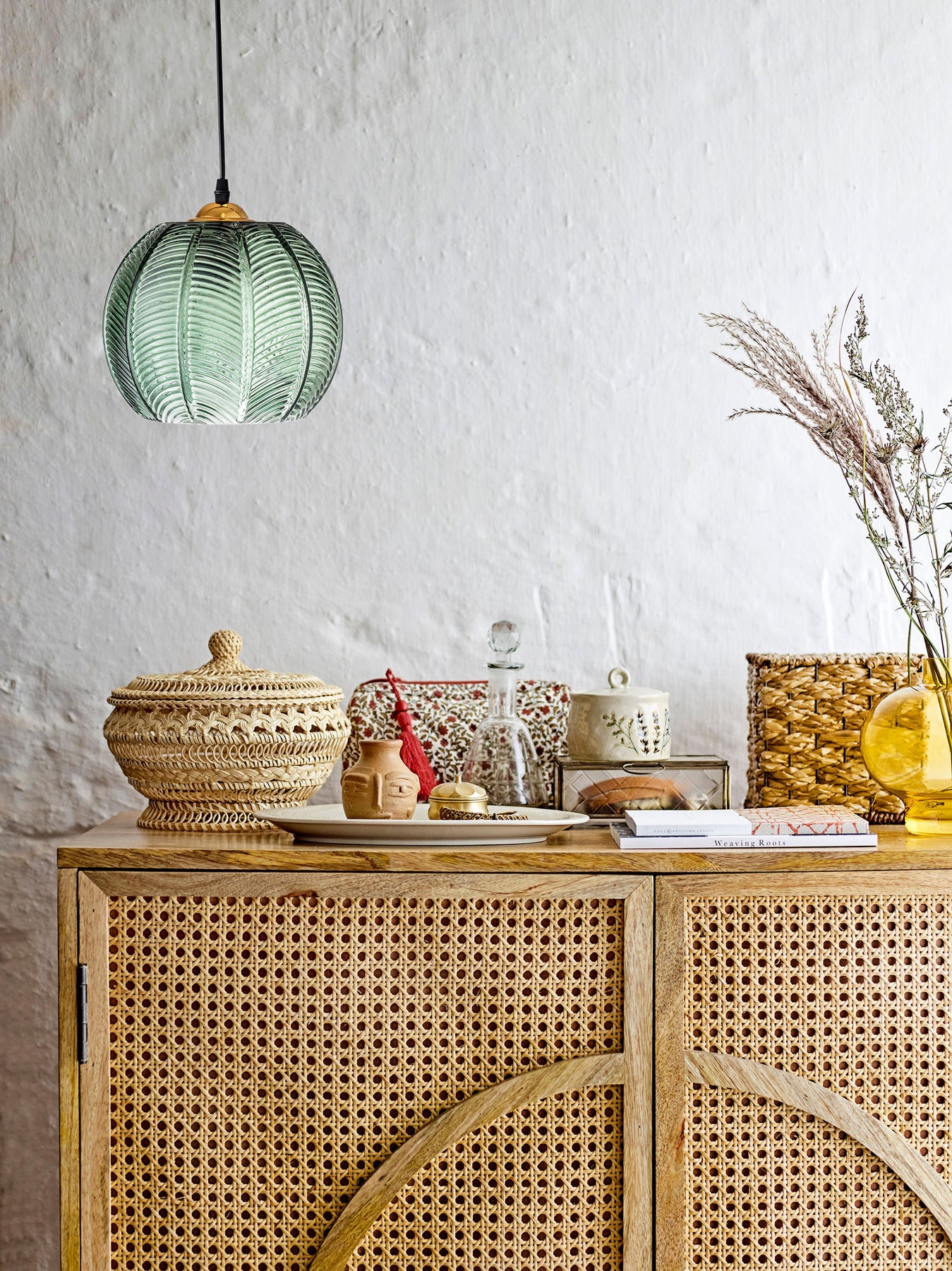 Skab en eksotisk stemning med denne Adar pendel. Det mørkegrønne glas er rillet for at simulere palmeblade, der skaber en meget eksotisk atmosfære - især når den er stylet med gyldne elements.