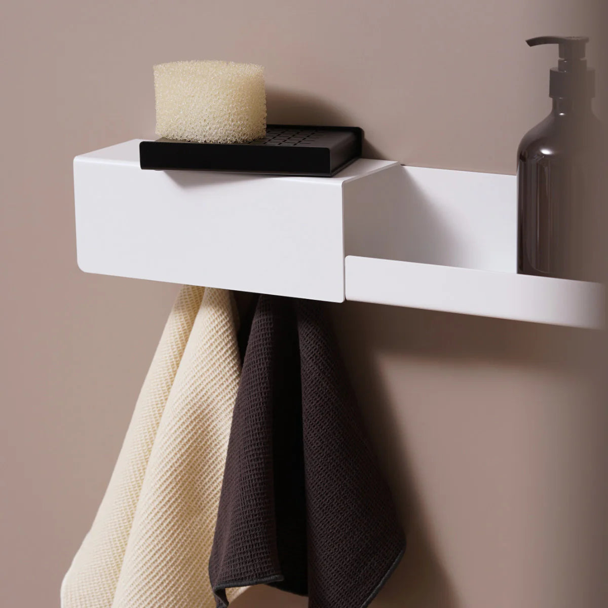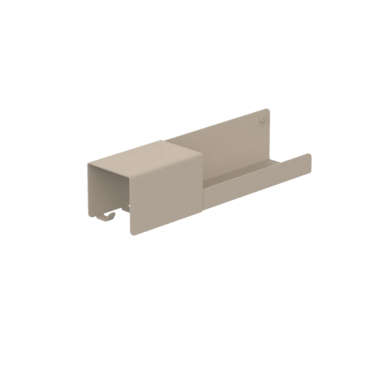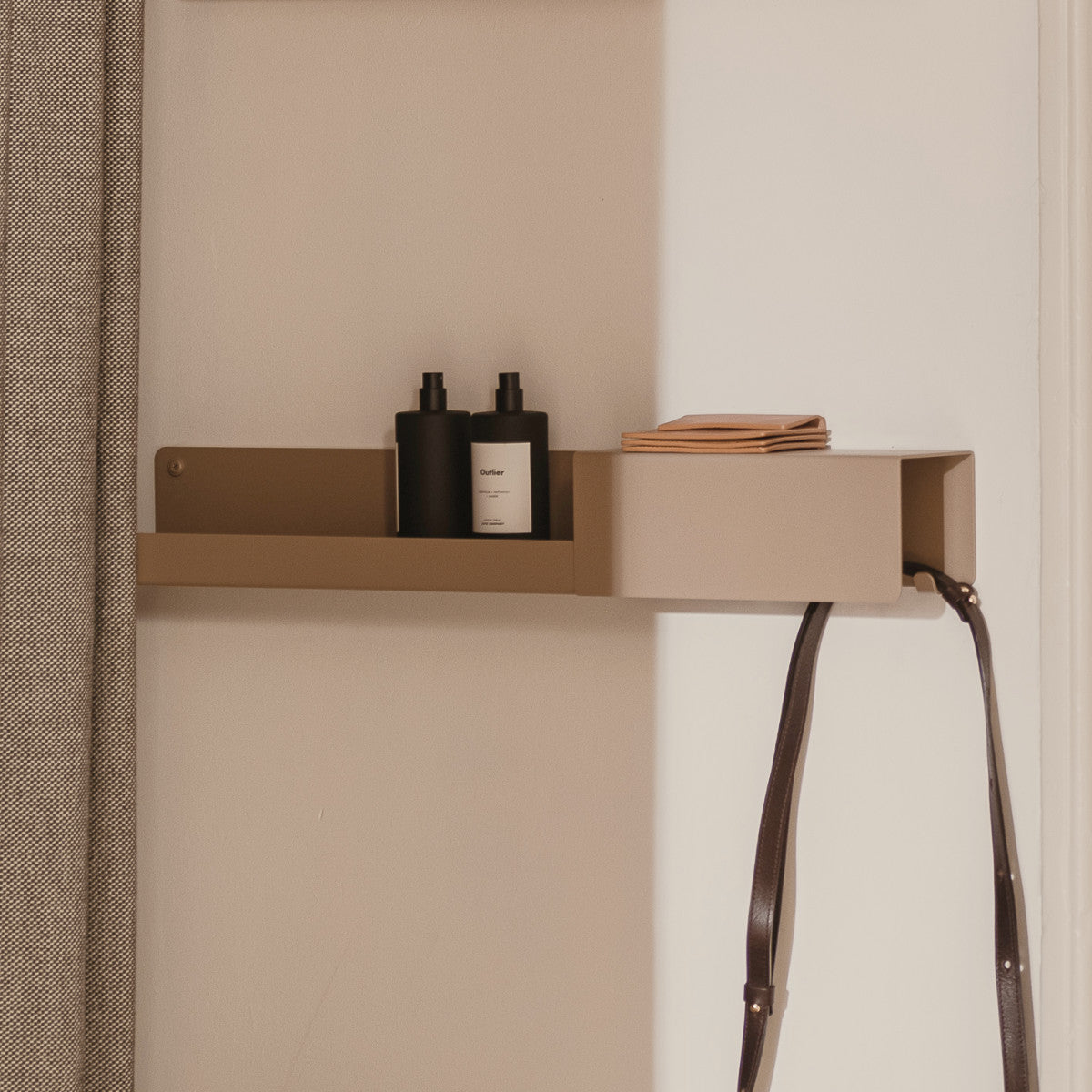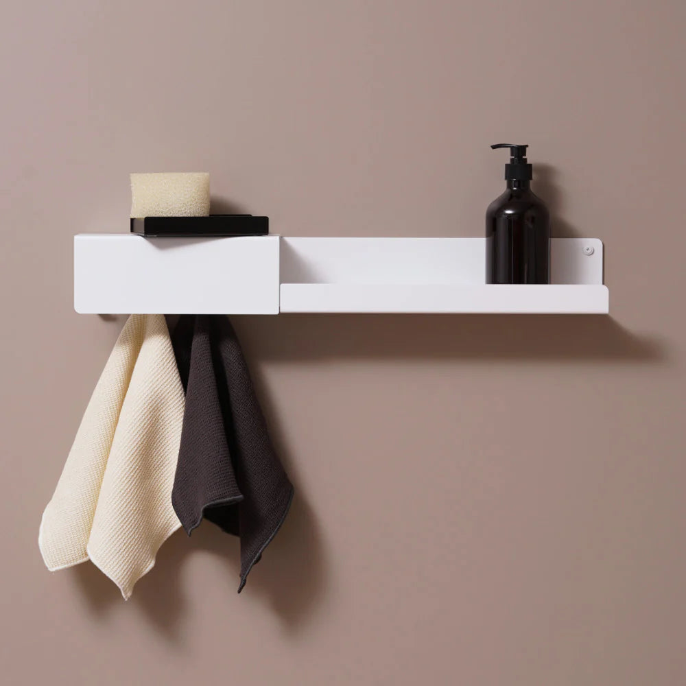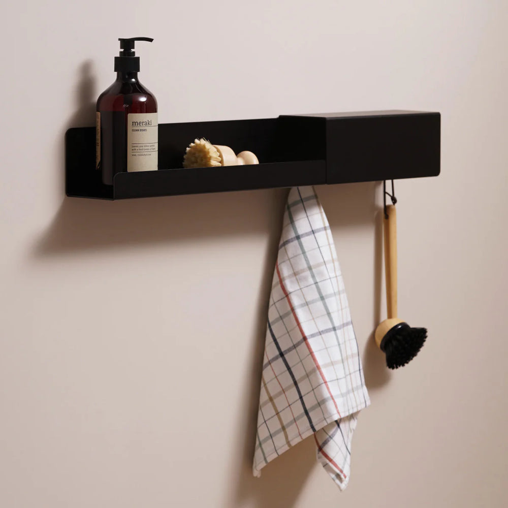 Den anden del er en lukket sektion med skjulte kroge, som giver et ryddeligt og minimalistisk udtryk. Krogene er diskret integreret og perfekte til ophængning af håndklæder, viskestykker, tasker, jakker eller accessories. Når krogene ikke er i brug, bevarer hylden sit rene, arkitektoniske udtryk – helt uden synligt rod.