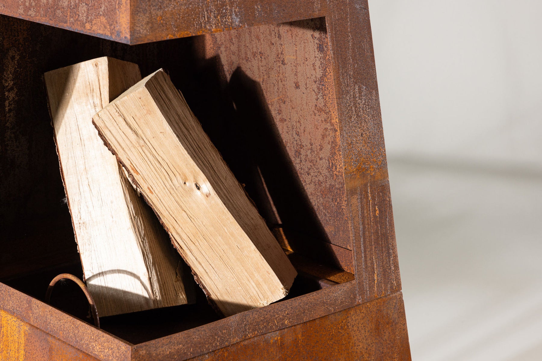 Pejsen er fremstillet af varmebestandigt stål, der gør den robust og velegnet til udendørs brug. Den rustne overflade er en bevidst designfeature, som både giver karakter og gør pejsen mindre sart over for vejr og vind. De to åbninger gør det lettere at tænde og vedligeholde flammerne, samtidig med at de skaber et smukt lysudfald, der gør enhver aften mere stemningsfuld. Uanset om du tænder en lille, rolig flamme eller en lidt større ild, skaber Bastin Eldkorg en varm og indbydende atmosfære for dig og dine gæster.